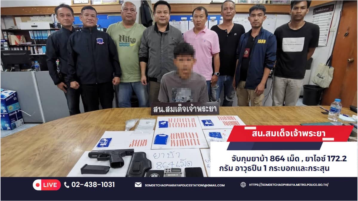 วันที่ 2 เมษายน 2567 ชุดสืบสวน สน.สมเด็จเจ้าพระยา จับกุมยาบ้า 864 เม็ด , ยาไอซ์ 172.2กรัม อาวุธปืน 1