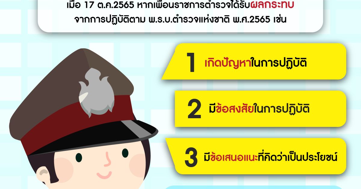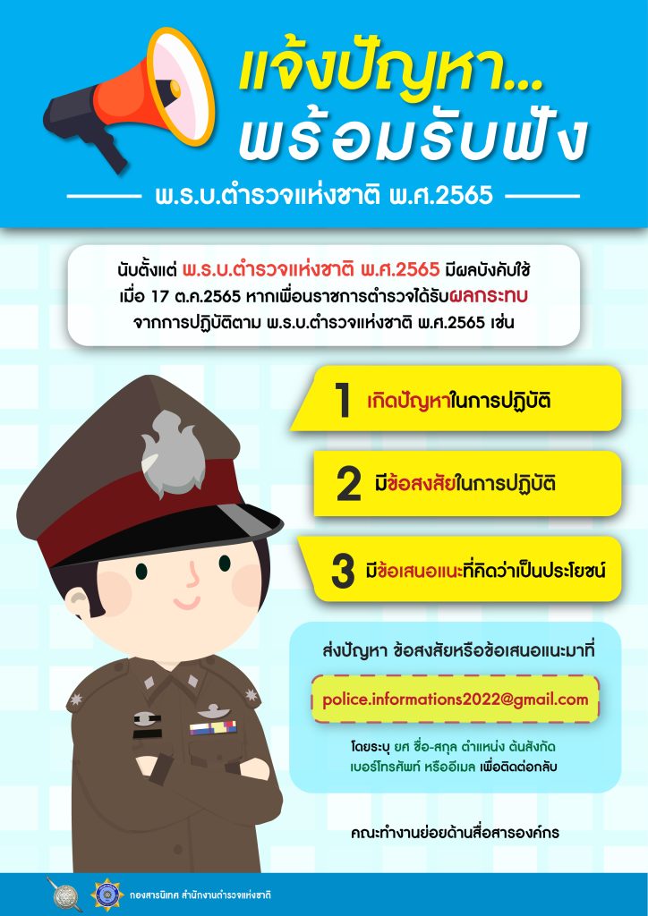 แจ้งปัญหาพร้อมรับฟัง 22 เมษายน 2567 โดย somdetchaophraya / ข่าวฝากประชาสัมพันธ์ หากข้าราชการตำรวจได้รับผลกระทบจากการปฏิบัติตาม พ.ร.บ.ตำรวจแห่งชาติ พ.ศ.2565 เช่นเกิดปัญหาในการปฏิบัติมีข้อสงสัยในการปฏิบัติมีข้อเสนอแนะที่เป็นประโยชน์ส่งปัญหา ข้อสงสัยหรือข้อเสนอแนะ มาได้ที่police.informations2022@gmail.com Facebook iconFacebookTwitter iconTwitterLINE iconLine